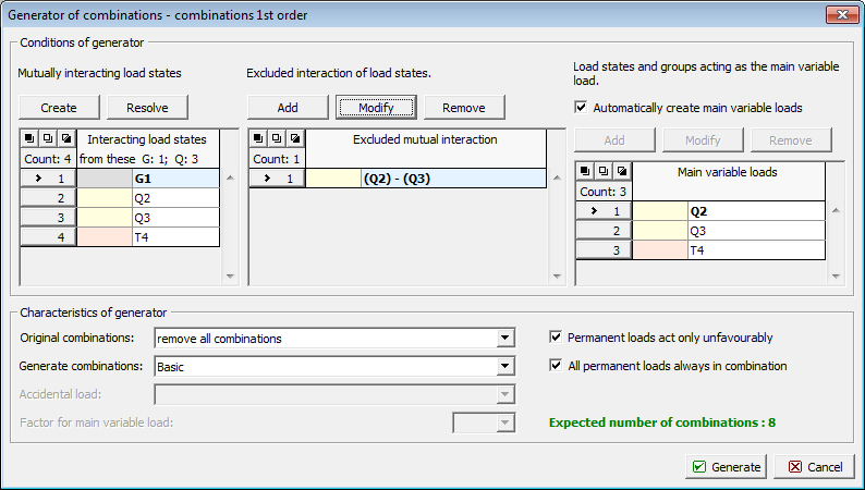 Dialog window "Generator of combinations" - Mutually interacting load states