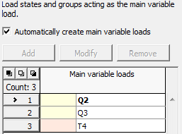 This part is available only when inputting loads according to EN 1990 is considered (the standard is selected in the "Material and standards" tab). When automatic regime is assumed then each variable load is taken as major in created combinations. If this regime is turned off, it is possible to manually adjust the list of major variable loads. For example, it is possible to remove an arbitrary load case from the list so that it will not be considered as major variable in combinations. If a new item with more load cases is add to the list then all load cases will be considered as major variable in those combinations, where they appear together.